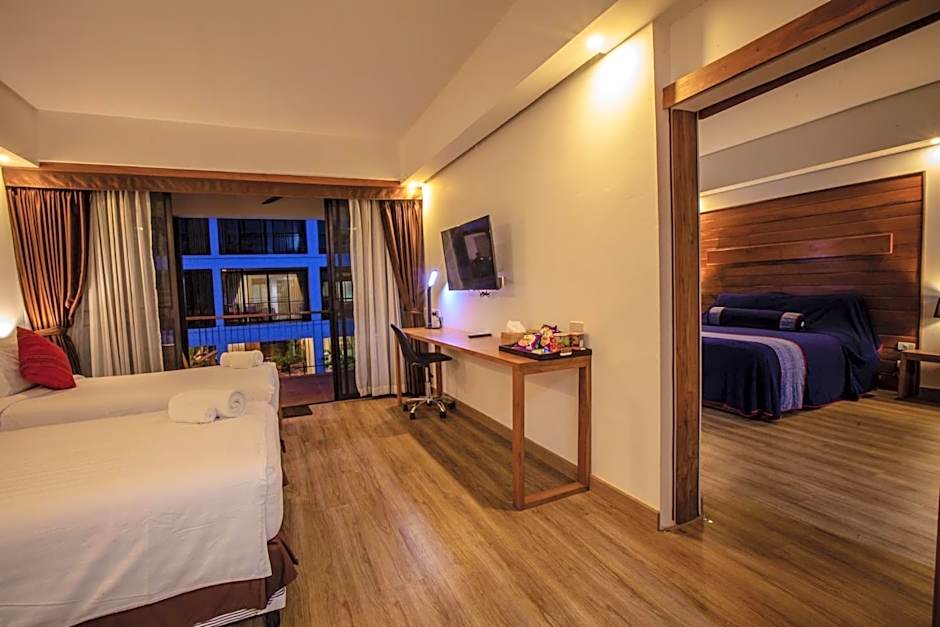 The spacious family room offers air conditioning, a mini-bar, a balcony with pool views as well as a private bathroom boasting a bath. The unit has 3 beds.